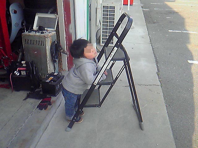 忙しそうに作業を進める店主の隣で、空を眺めながらぼ~っとくつろぐ2歳児。