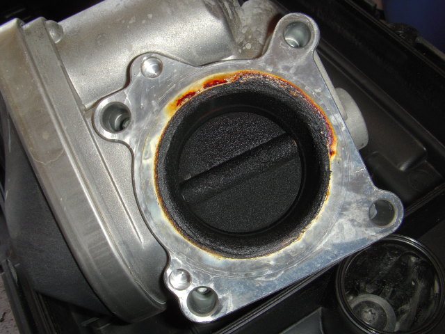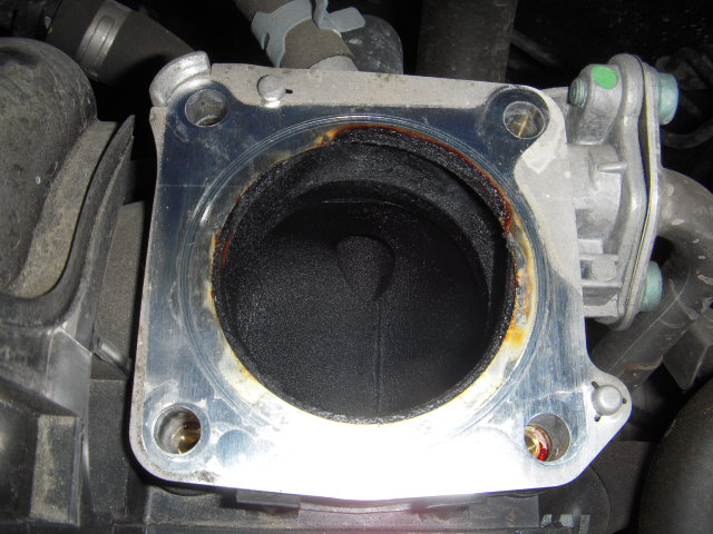 案の定‥スロットルバルブ内は焼きついたスラッジだらけで、バルブ自体の開閉にも支障がありそうなくらいになってました。