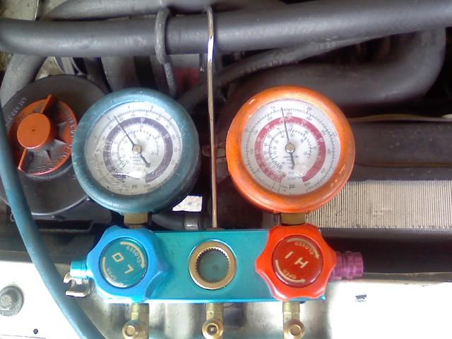 `87式と古い年式のクルマなので冷媒はR12。代替フロンで対応します。