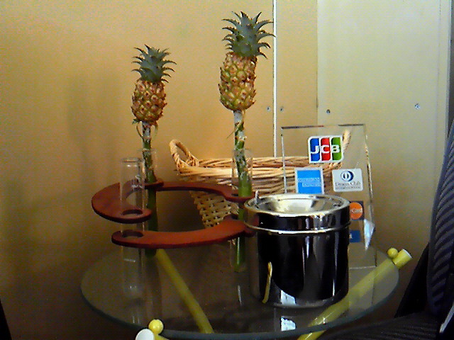 どれくらい傷まずにもつのか不明ですが、しばらくは1輪挿しにパイナップルが刺さってる、なんとも不思議な光景が楽しめそうです(笑)